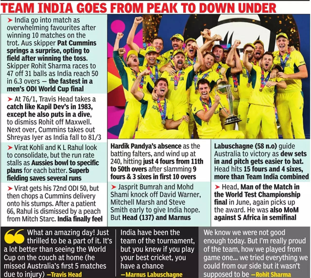 AHMEDABAD: Even as Travis Head's scintillating hundred was the cornerstone of Australia's sixth ODI World Cup triumph on Sunday night, the heart-warming story of Marnus Labuschagne, who played an equally vital role in the six-wicket win in the final against hosts India at the Narendra Modi Stadium, stroking a patient 58 not out in a match-winning 192-run partnership for Australia for the fourth wicket, which took the World Champions to the title after they had been reduced to 47 for three, is the stuff fairytales are made of.