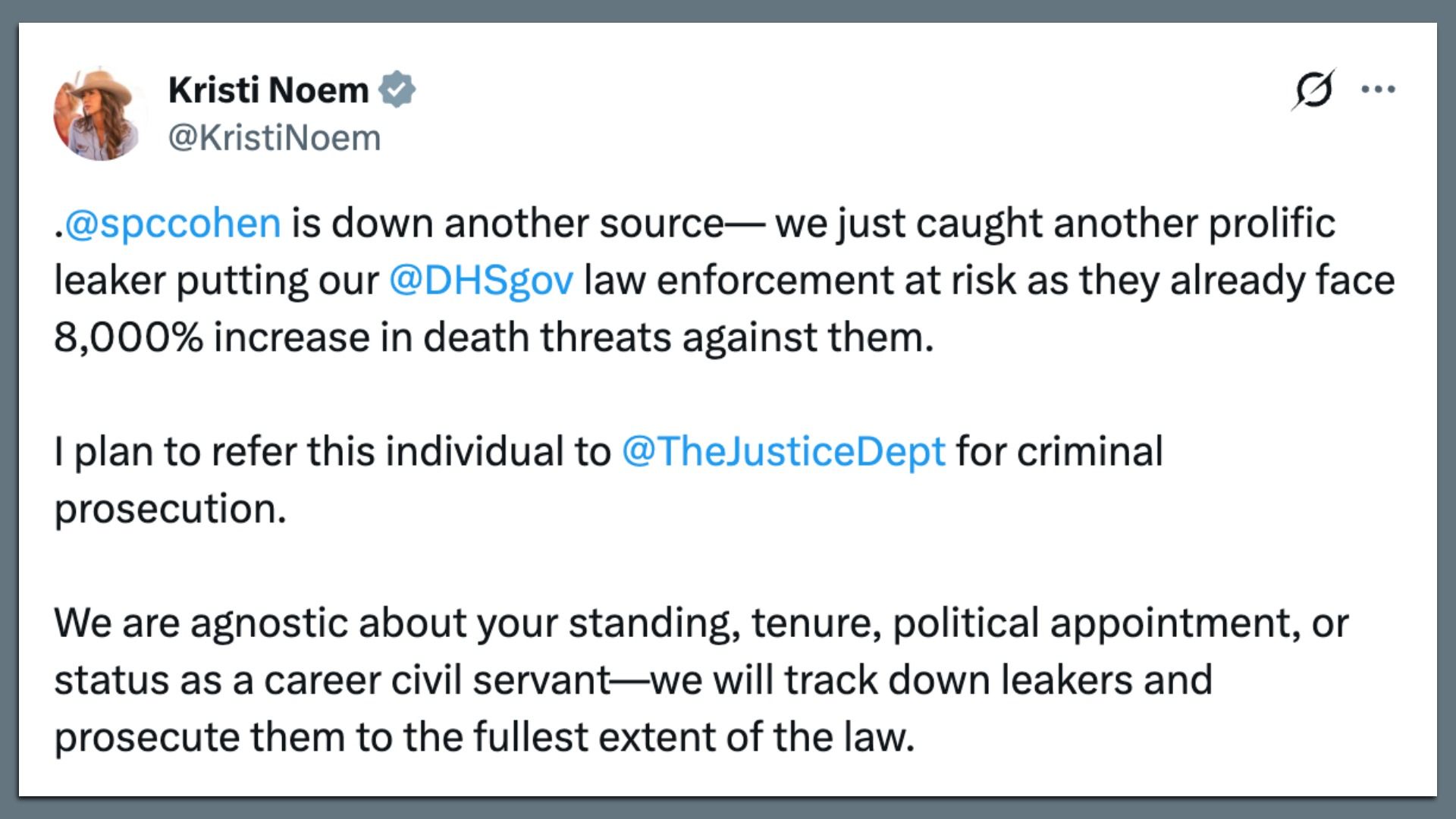 - Noem announced in March her department had "identified criminal leakers within" DHS and she was referring them to the DOJ for "felony prosecutions."