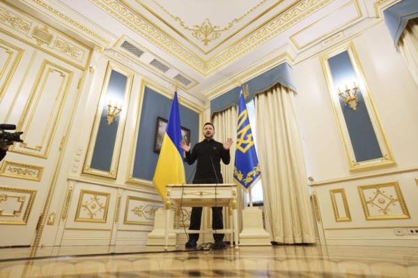 Ukrainian President Volodymyr Zelenskyy speaks to journalists during press conference in Kyiv, Ukraine, Wednesday, Feb. 26, 2025. (AP Photo/Evgeniy Maloletka)