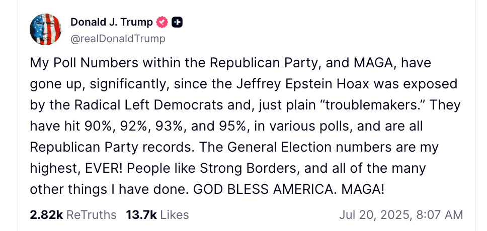 - Trump claims he's hit 'record' polling numbers with MAGA and GOP since 'Epstein hoax'