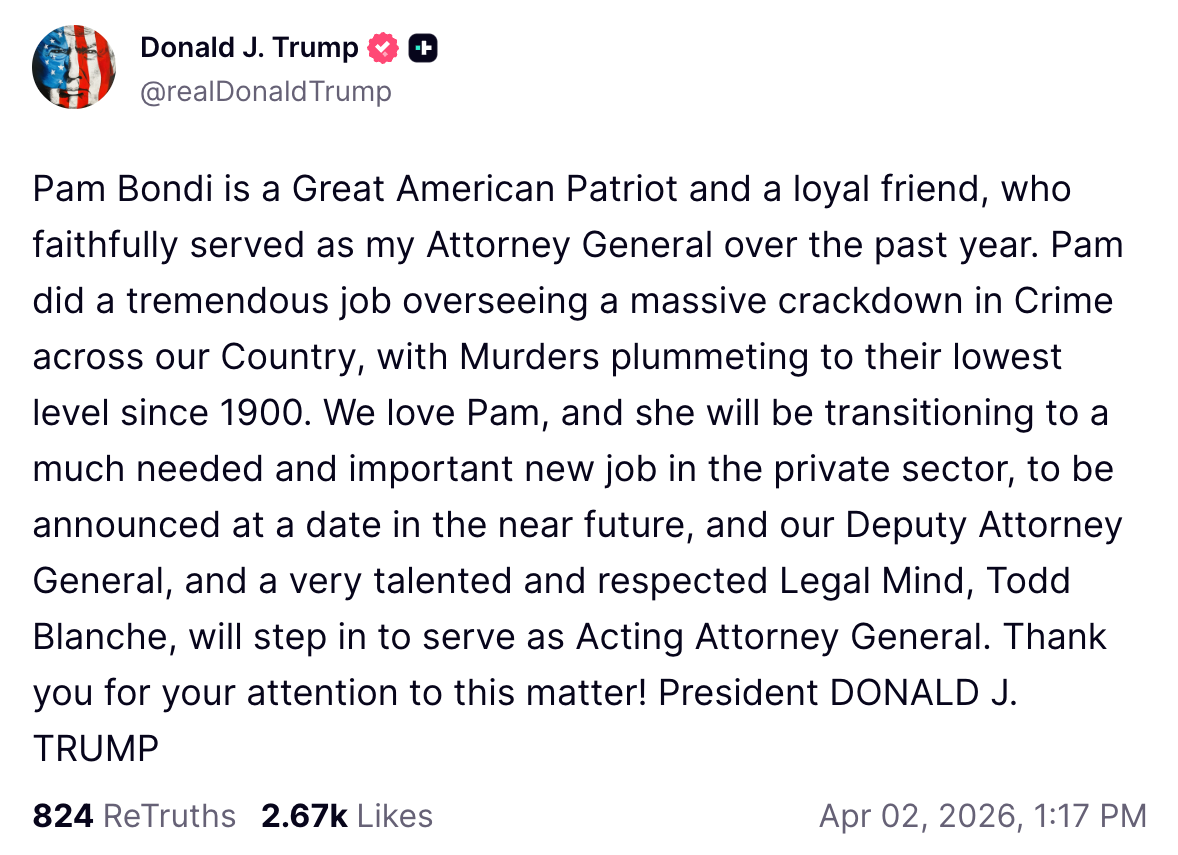 — Attorney General Pamela Bondi (@AGPamBondi) April 2, 2026