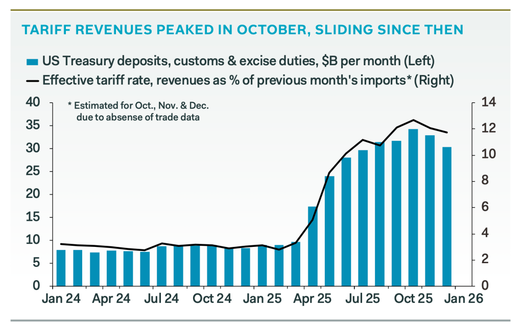 In fact, U.S. government revenue from Trump’s tariffs is already in decline, according to a research note from Pantheon Macroeconomics on Tuesday. That suggests their effect on inflation will get weaker as time goes by. Tariff revenues peaked at $34.2 billion in October and then declined to $32.9 billion in November and $30.2 billion in December, Pantheon’s data shows.