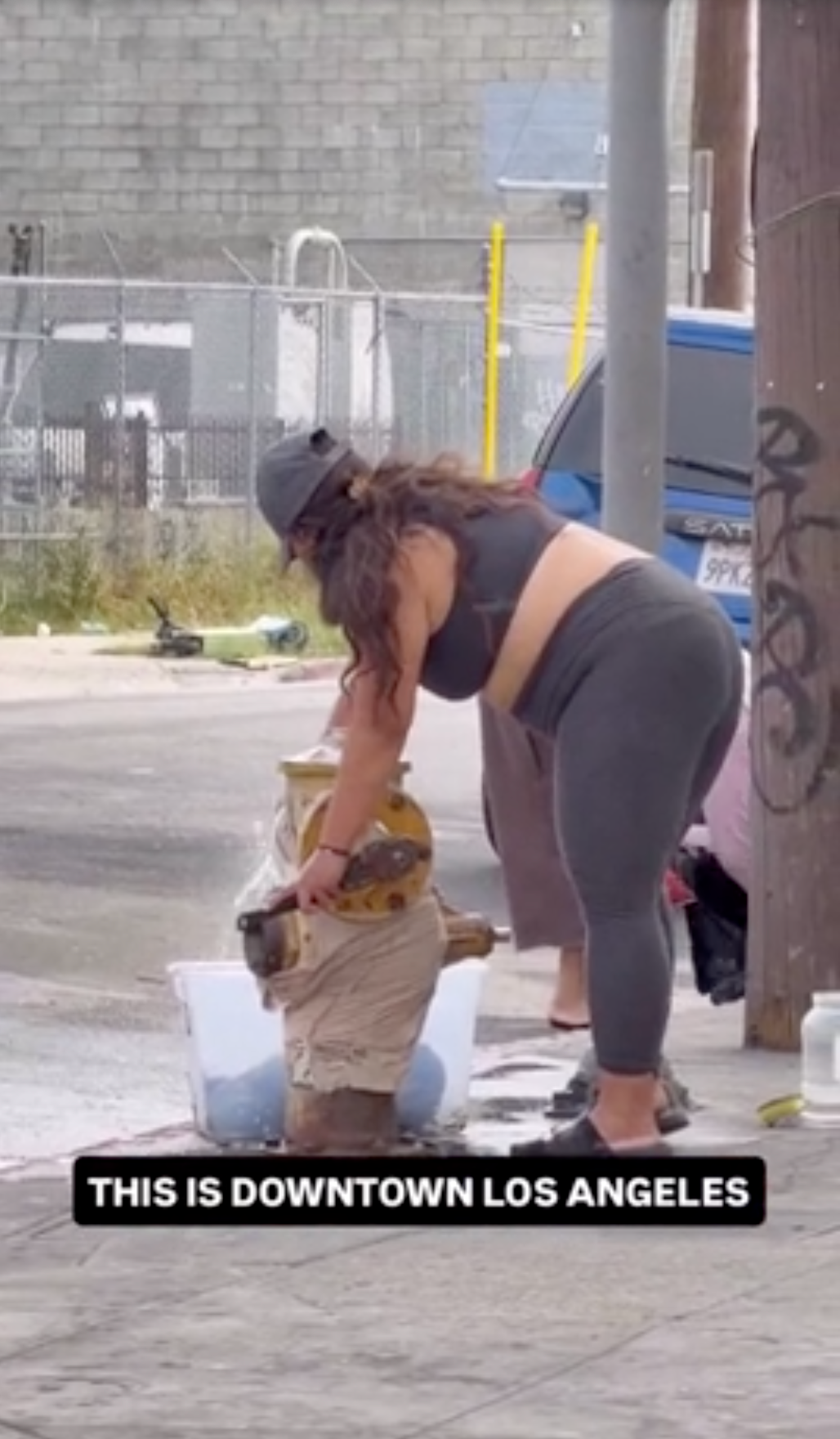 The woman can be seen in the video dumping a large plastic container of dirty water into the street as a car passes by. She then drops a blanket into the container and turns a wrench on a fire hydrant to fill the receptacle back up.