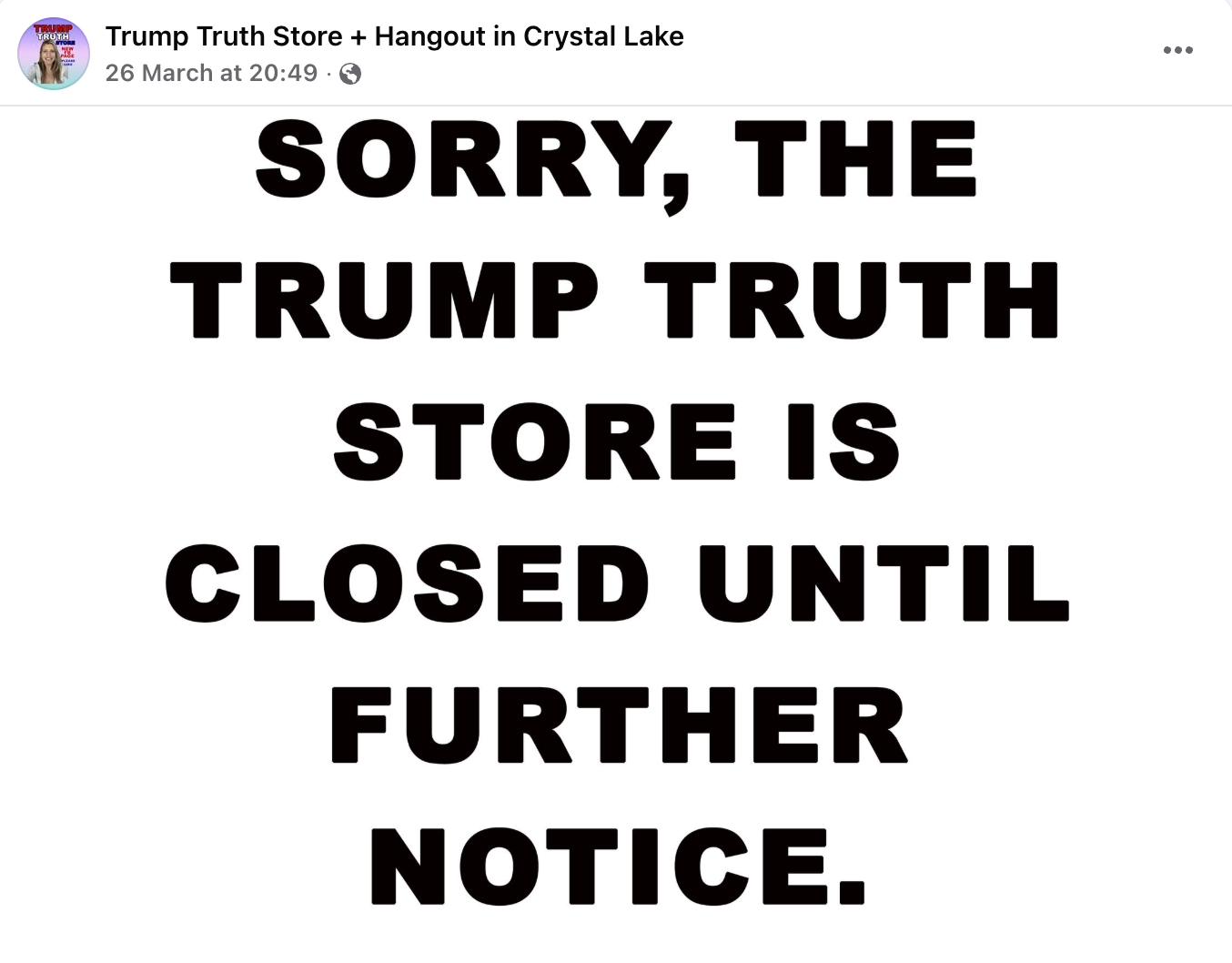 Lisa Fleischmann, owner of the Trump Truth Store + Hangout in Crystal Lake, a suburb of Chicago, Illinois, announced her decision on Facebook with a note that read simply: “Sorry, the Trump Truth Store is closed until further notice.”