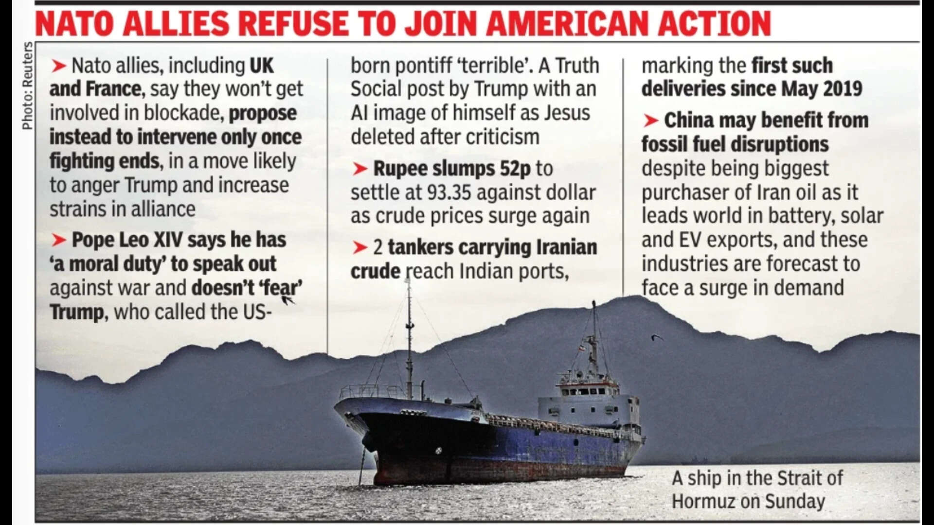 WASHINGTON : The US military said it would begin enforcing President Donald Trump-announced blockade of the Hormuz Strait at 10am EST on Monday (7.30pm IST), while clarifying that the embargo will only apply to vessels entering or departing Iranian ports and not other Gulf entrepôts. Iran responded by saying “no port in the Persian Gulf and the Arabian Sea will be safe” if the security of its ports is threatened.