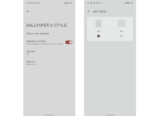 The rest of the changes are relegated to the Settings app for now. Nothing’s dot-matrix font appears throughout, along with with some new iconography for selecting the size of app grids.