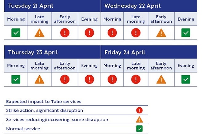 Buses are expected to run as usual, aside from seven routes operated by Stagecoach from Bow Bus Garage, which are being affected by a separate strike from 5am on three Fridays, 17 and 24 April and 15 May, lasting 24 hours until 5am the following day.