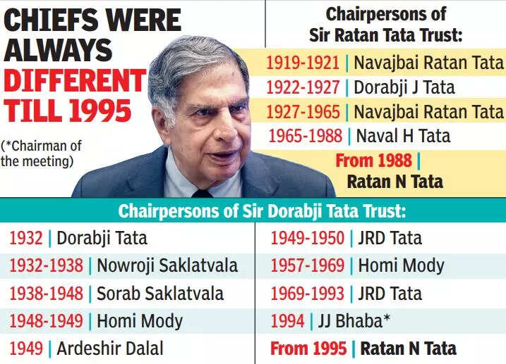 MUMBAI: Tata Trusts may consider having separate chairpersons for its two flagship foundations, Sir Dorabji Tata Trust (SDTT) and Sir Ratan Tata Trust (SRTT), which together own a majority stake in the holding company that controls the $103-billion aviation-to-automobile conglomerate.