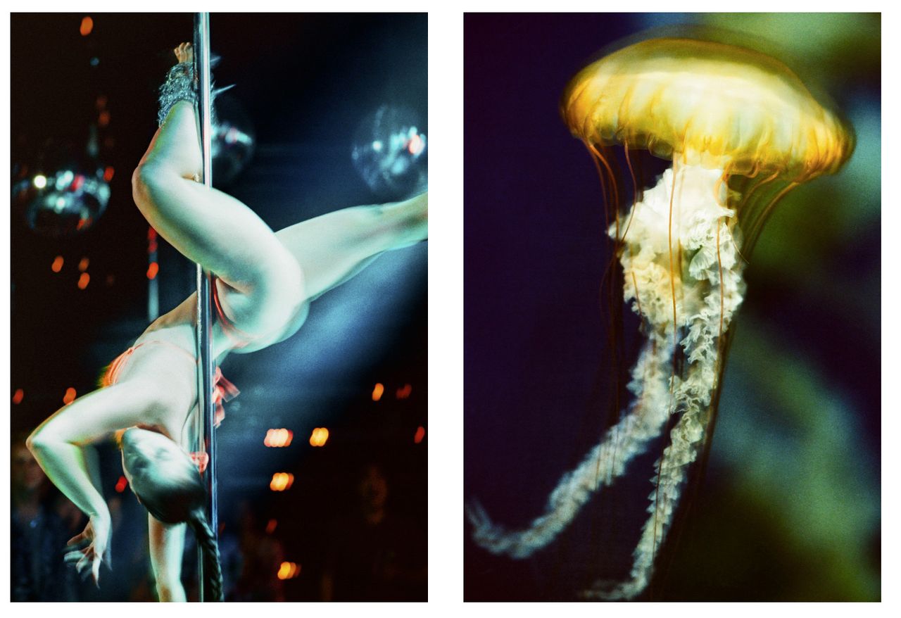 The pairing sounds eccentric until you look at the images themselves. A dancer's sweeping arm meets the trailing tendrils of a jellyfish; the curve of a torso answers the dome of a bell. On film, both subjects are rendered with the same grain, the same tonal palette, the same commitment to the moment. The analogue process collapses the difference between nightclub and ocean.