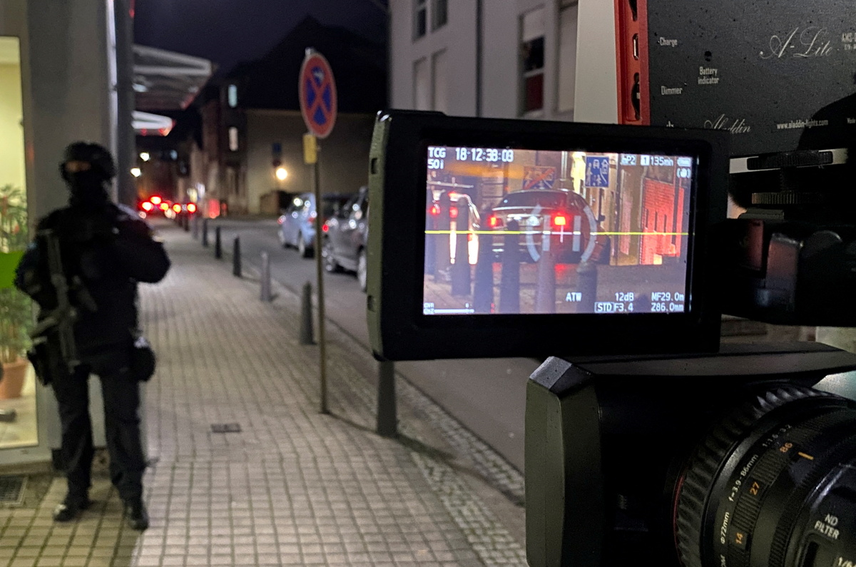 A cameraperson films a street following an arrest in Sulzbach, Germany, after two German police officers were fatally shot early January 31, 2022, during a routine traffic stop near Kusel, southwestern Germany. Police were searching for the suspects, who fled the scene, police in the state of Rhineland-Palatinate said in a statement. REUTERS/Stephane Nitschke