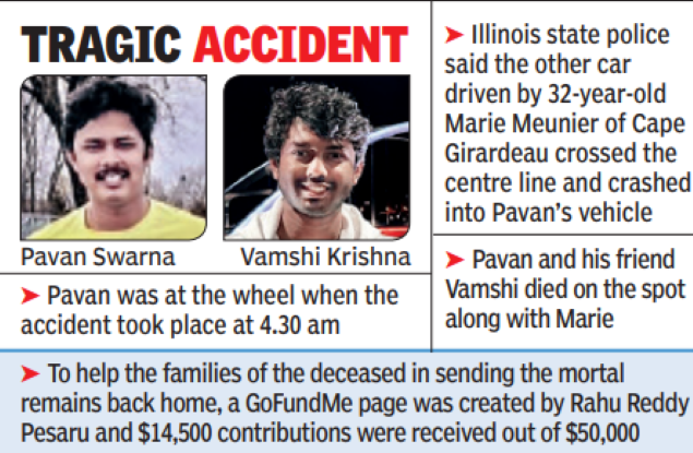 Pavan was at the wheel when the accident took place at 4.30 am. Illinois state police said the other car driven by 32-year-old Marie Meunier of Cape Girardeau crossed the centre line and crashed into Pavan's vehicle. Pavan and Vamshi died on the spot along with Marie. Three students - Kalyan Dorna, Karthik Kakumanu and Yashwanth Uppalapati who were travelling with Pavan - suffered injuries and have been hospitalised.