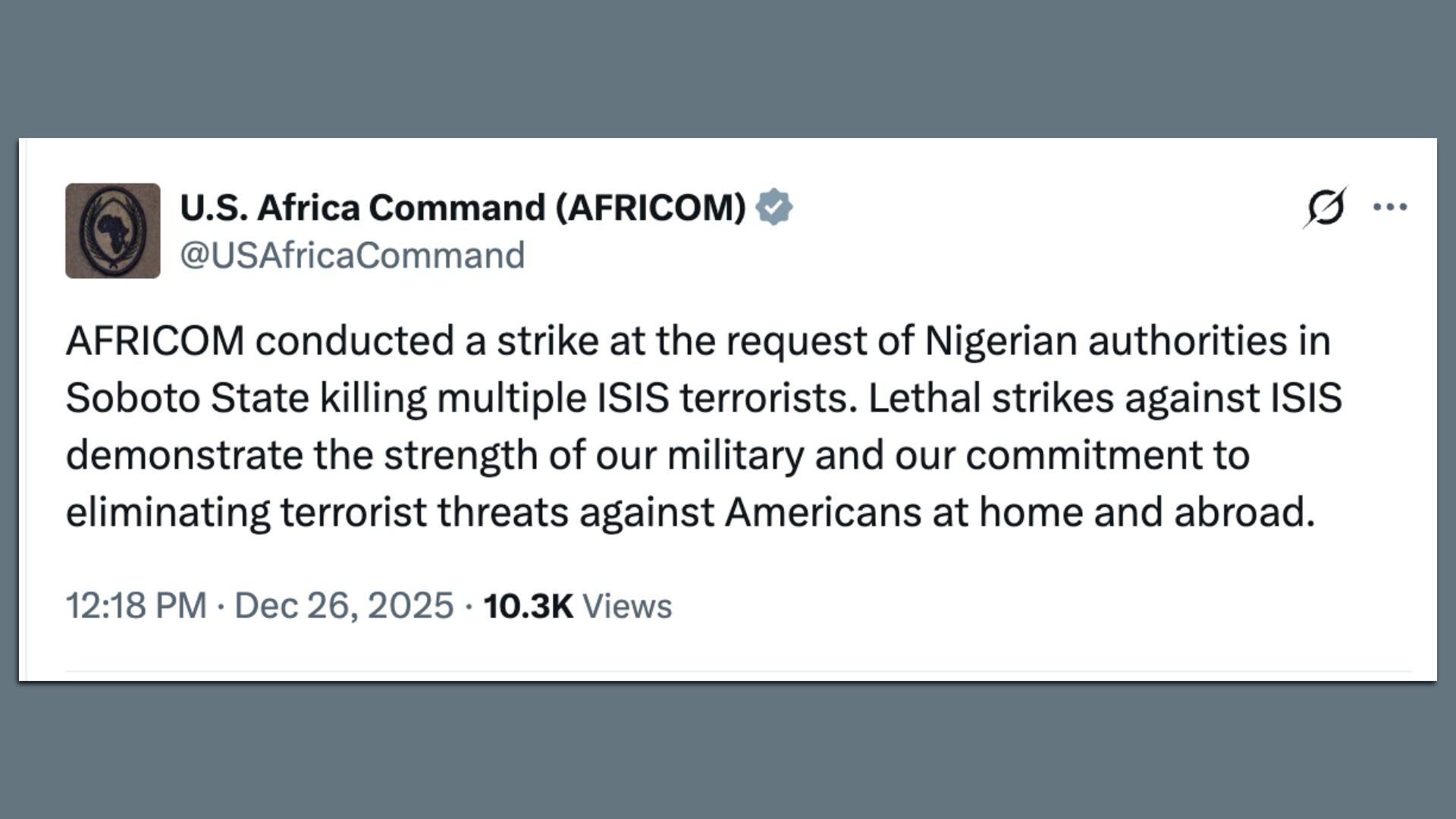 The big picture: U.S. Africa Command (AFRICOM) said on X U.S. forces "conducted a strike at the request of Nigerian authorities in Soboto State killing multiple ISIS terrorists," an apparent reference to Sokoto state.
