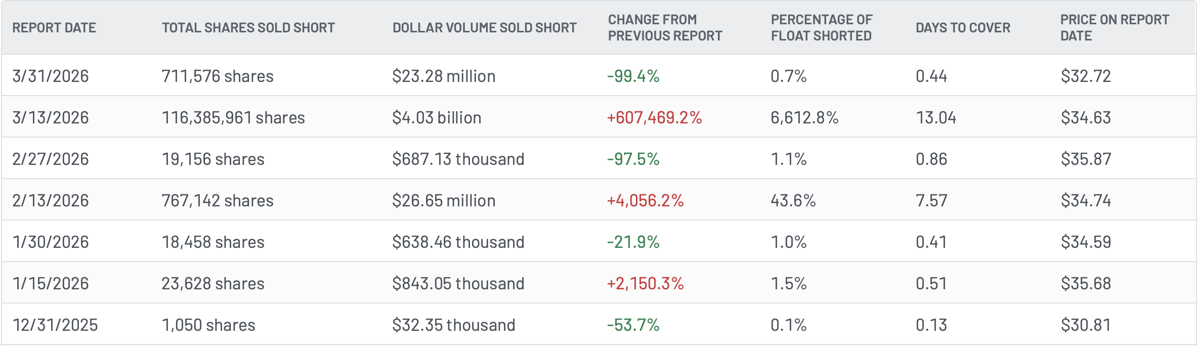 But that spike proved fleeting: by the next report on March 31, short interest had collapsed to 711,576 shares (about $23.28 million), essentially unwinding the prior surge.
