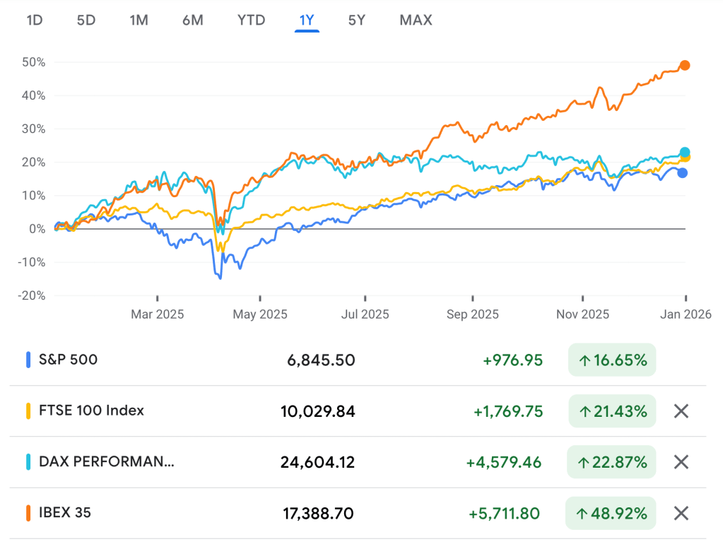 The S&P also performed poorly compared to Germany’s DAX (up 23%) and Spain’s IBEX 35 (up 48%)