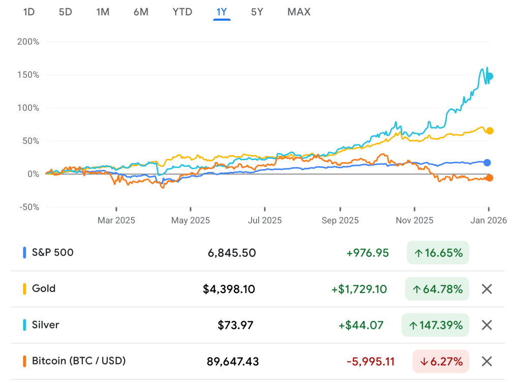 And let’s not talk about gold, which rose 65%, or silver which was up 147%. Bitcoin lost 7% over the period.