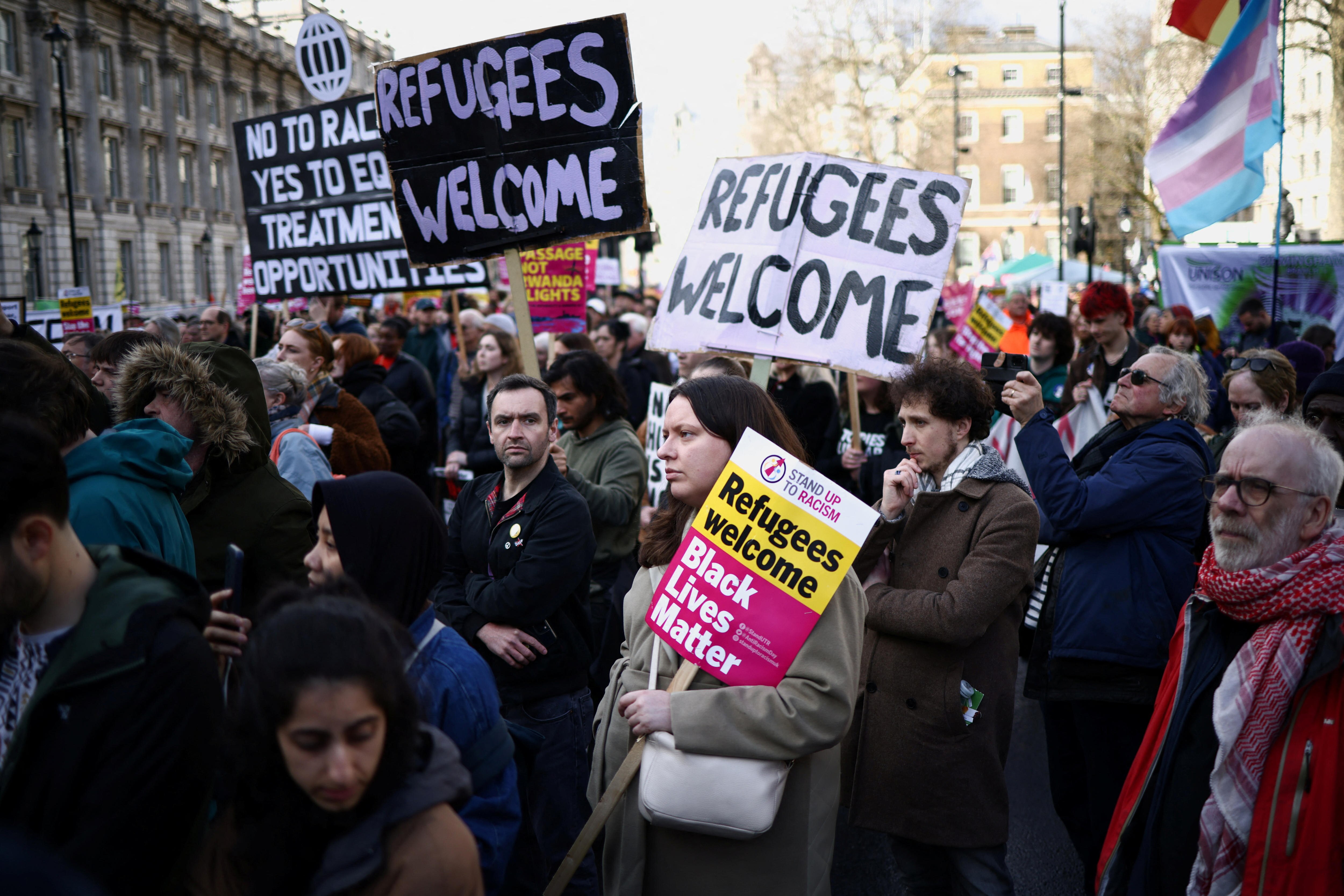 Protesters in the UK capital carried signs reading "no human being is illegal" and "Safe passage, not Rwanda".