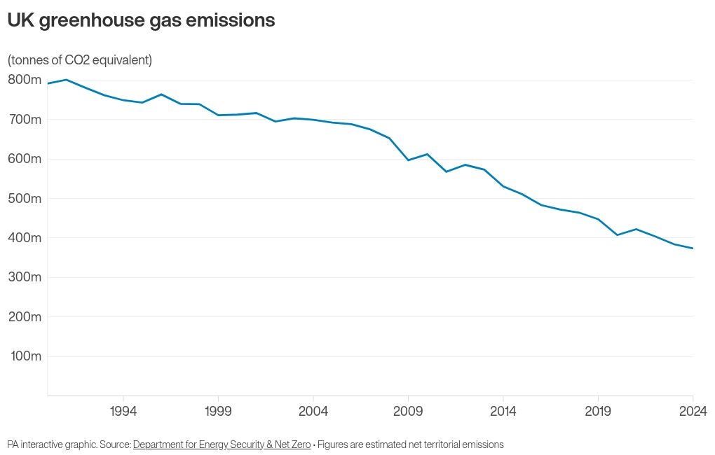 The UK’s climate-warming pollution fell 3% in 2024, the latest Government figures show.