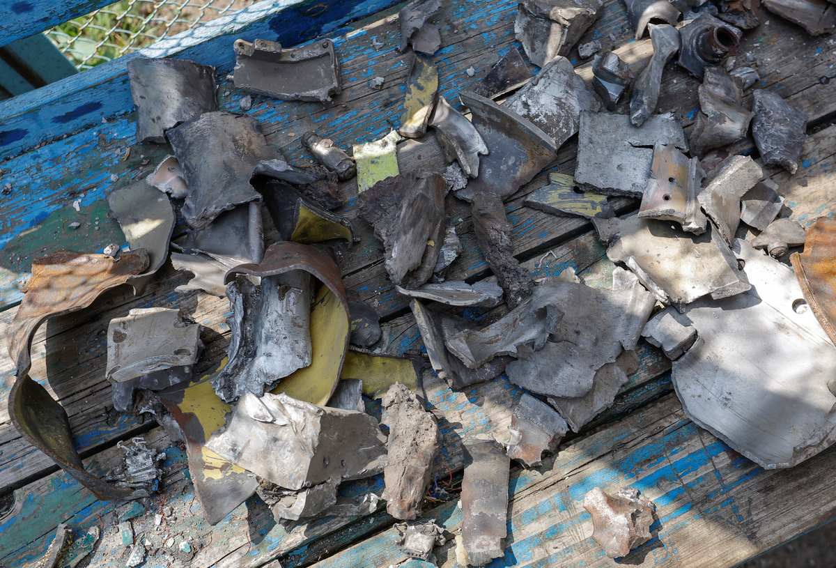 Shell fragments had been laid out on a blue metal bench. It was not immediately possible to detect any identifying markings and it was not clear where the fragments had been collected.