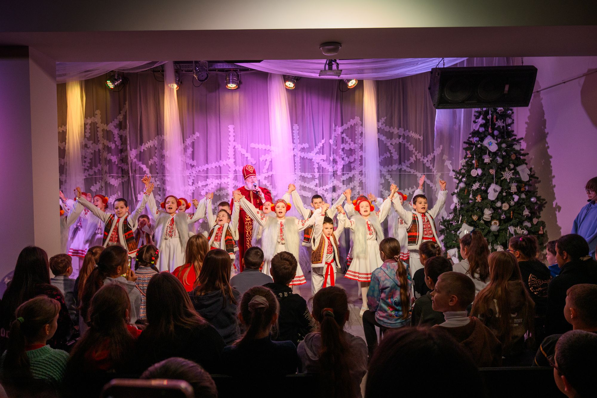 Basement theatre: Children watch and dance during a St Nicholas Day performance