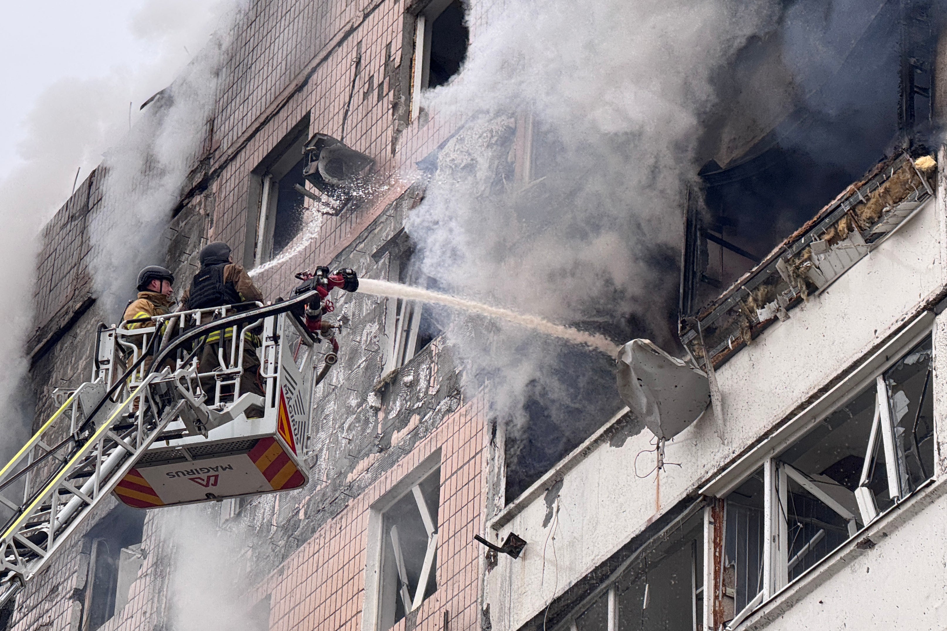 Slyusar also said parts of a high-rise apartment block under construction were damaged in the city and two private homes burned down in a nearby town.