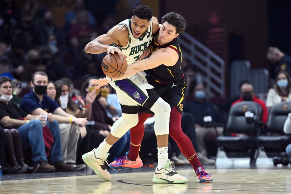 CLEVELAND, OHIO - JANUARY 26: Cedi Osman #16 of the Cleveland Cavaliers guards Giannis Antetokounmpo #34 of the Milwaukee Bucks during the second quarter at Rocket Mortgage Fieldhouse on January 26, 2022 in Cleveland, Ohio. (Photo by Jason Miller/Getty Images) Getty Images