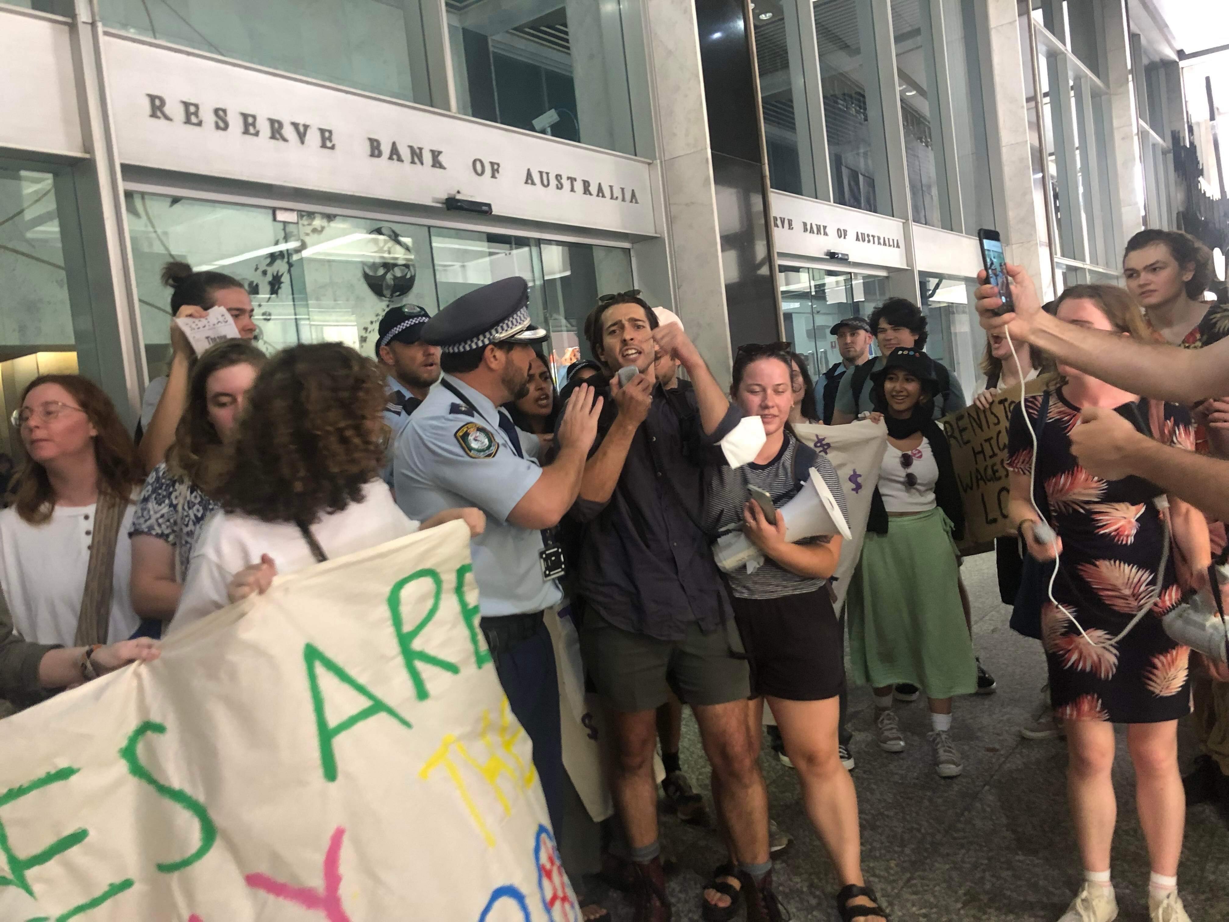 "We put every landlord on notice, we want to put the corporations of the world on notice, you've got our wealth and we're going to take it back," student activist Jack Mansell yelled outside the Reserve Bank's main entrance.