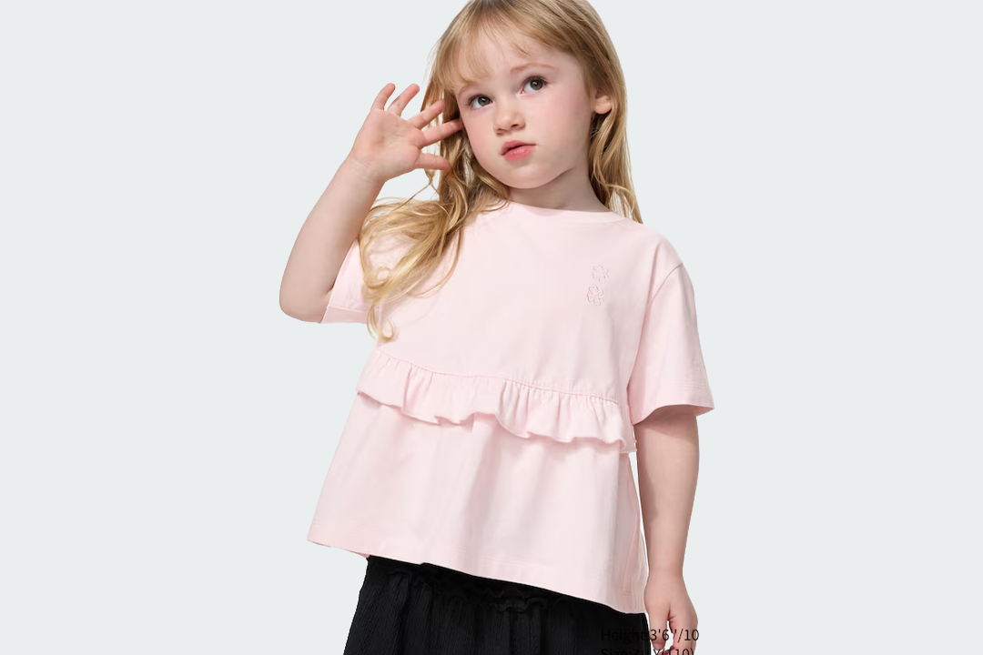 The childrenswear line spans sweet tops like this frill baby pink number, as well as dresses, skorts and more – all designed to complement and match the womenswear. Available in years three to 13, the frilly top comes in pink, black or white colourways, and is crafted from 100 per cent cotton.