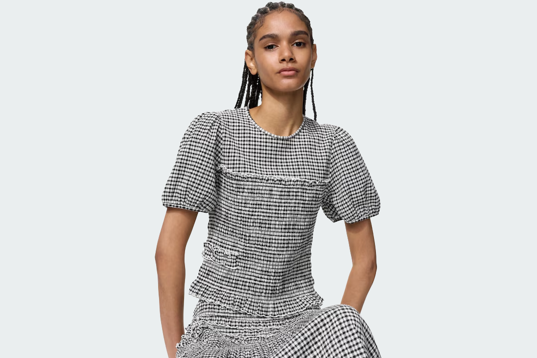 An elevated top for everyday wear, this shirring styles is distinguished by its feminine detailing, from the bow at the back to the frill hem and sleeves. The fitted top if designed to flare out slightly, creating a flattering silhouette. Available in red, white, black or gingham, the top is a steal for your spring wardrobe at £24.