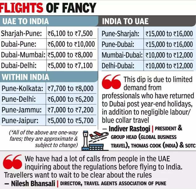 PUNE: The current return fares of flights to different Indian cities from the United Arab Emirates (UAE), considered to be amongst the most popular destinations from Pune as well, are extremely low, even as India relaxes international travel norms from Monday onwards.