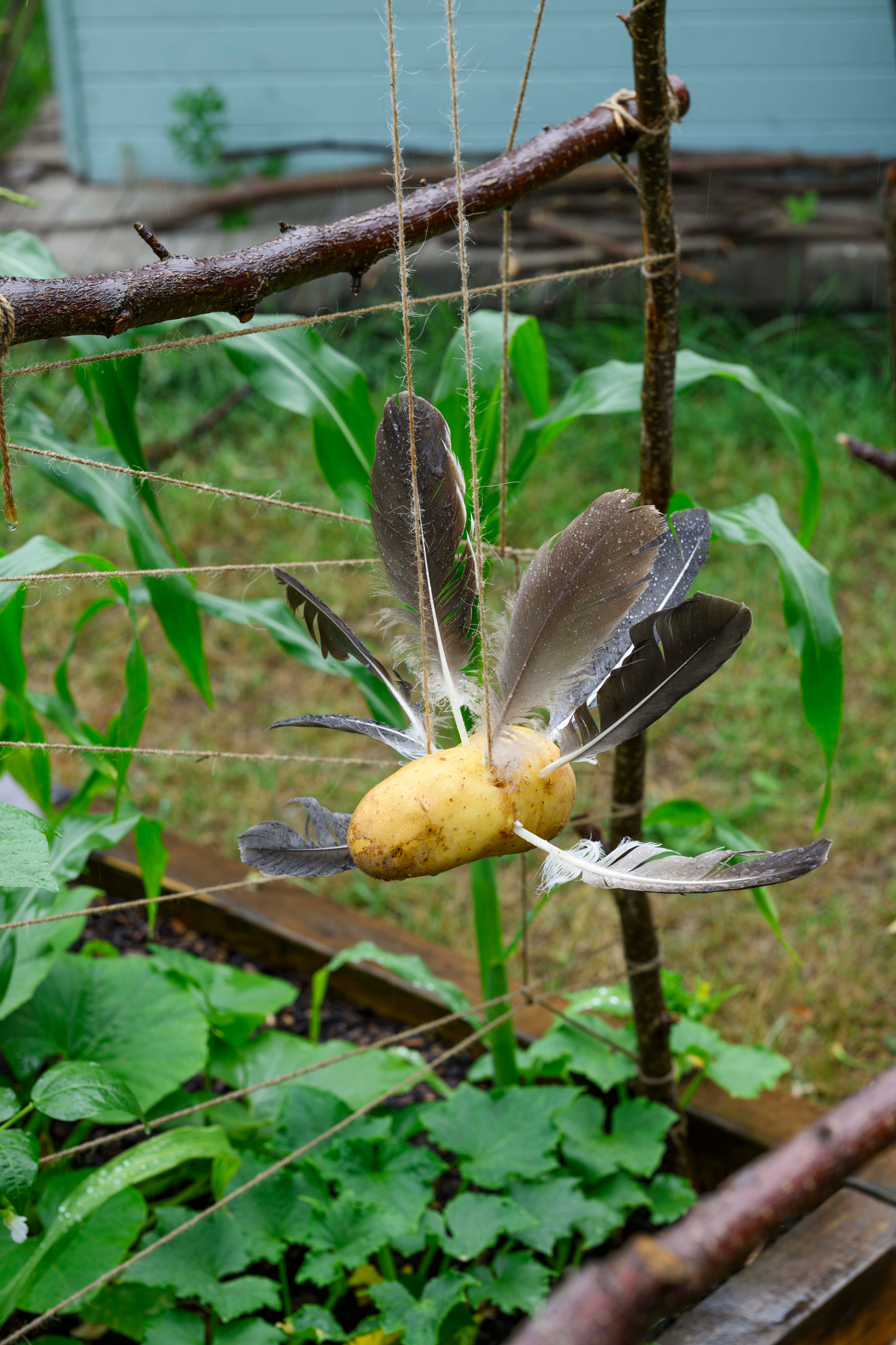 “Basically you take an old potato, stick feathers in it, then use a skewer to make a hole through the middle of it, get a piece of string and thread it through and tie the potato up, suspending it over your crops. It moves in the wind and scares birds,” he says.