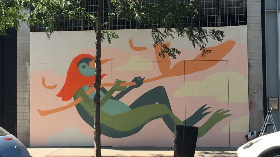 Catherwood, 32, grew up in Crystal Lake. And she sees nature as her “comfort place.” So, for a mural she did at 1704 N. Damen Ave. in Wicker Park, she imagined one of them shuttling a half-bird, half-frog creature down from the sky.