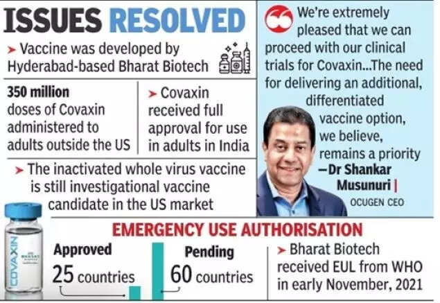 HYDERABAD: The US Food and Drug Administration (USFDA) has lifted the clinical hold on the Phase 2 and 3 immuno-bridging clinical trials of Bharat Biotech’s Covid-19 vaccine, Covaxin, in the US.