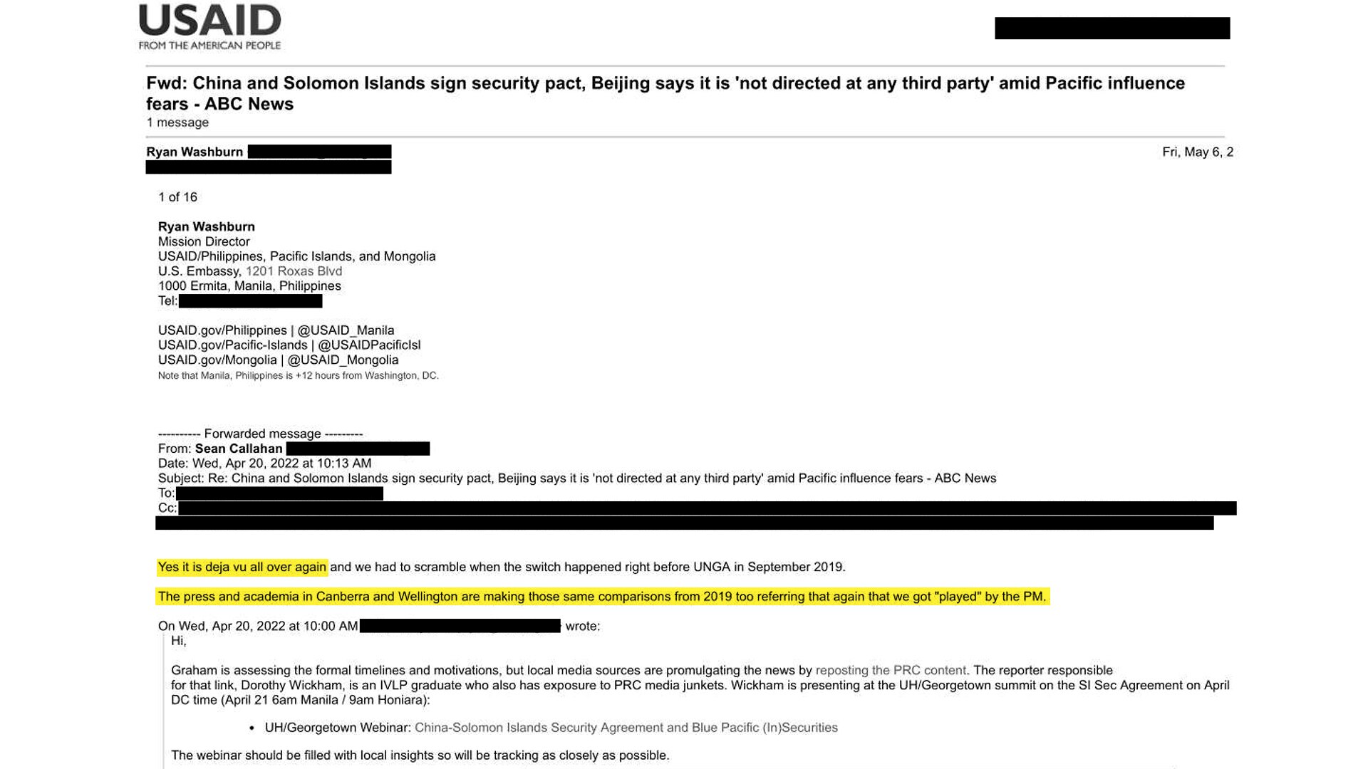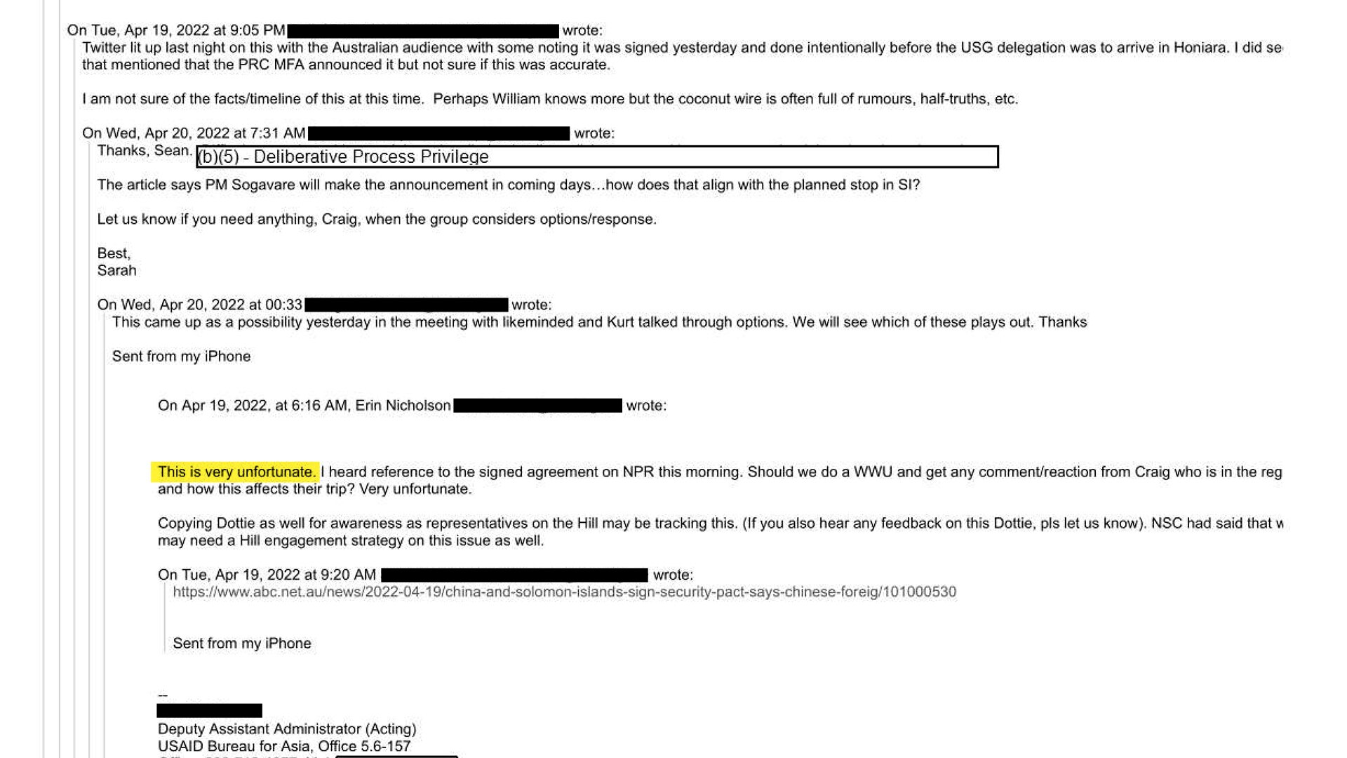 United States officials described the signing of a security pact between China and Solomon Islands as "very troubling" in internal emails, a freedom of information (FOI) request has revealed.