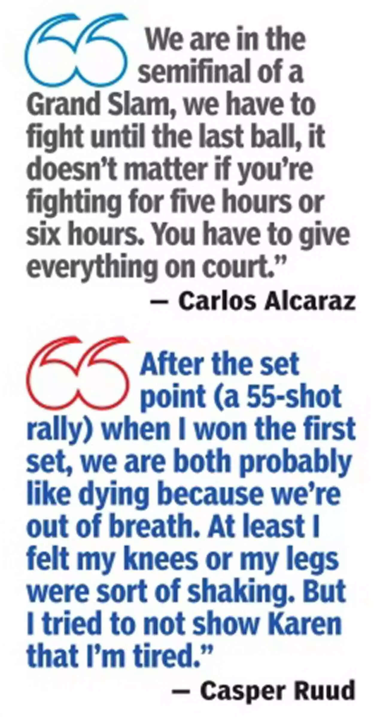 Ruud, whose four-set semifinal win over Russian Karen Khachanov was completed earlier in the evening, thought playing Alcaraz in the title match would be fair for everyone.