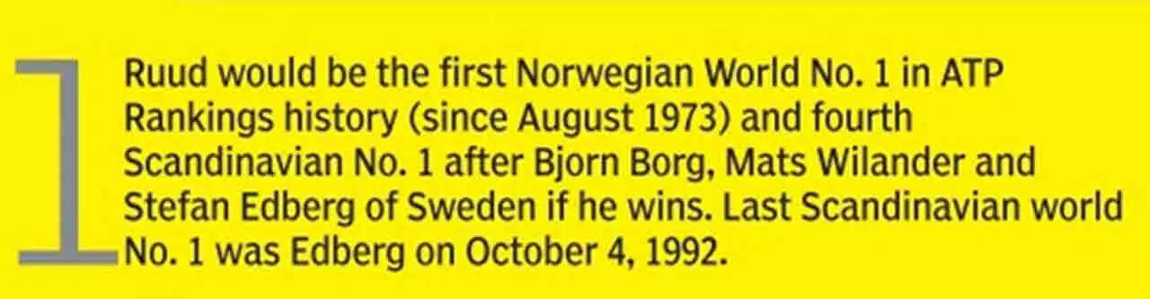 Ruud's first memory of watching television was Rafael Nadal winning the 2005 French Open. It made the seven-year-old want to be on TV too. The 23-year-old Norwegian's father - Christian, a former pro, whose highest ranking was No. 39 - recalled that one of his son's earliest goals was to be No. 1.
