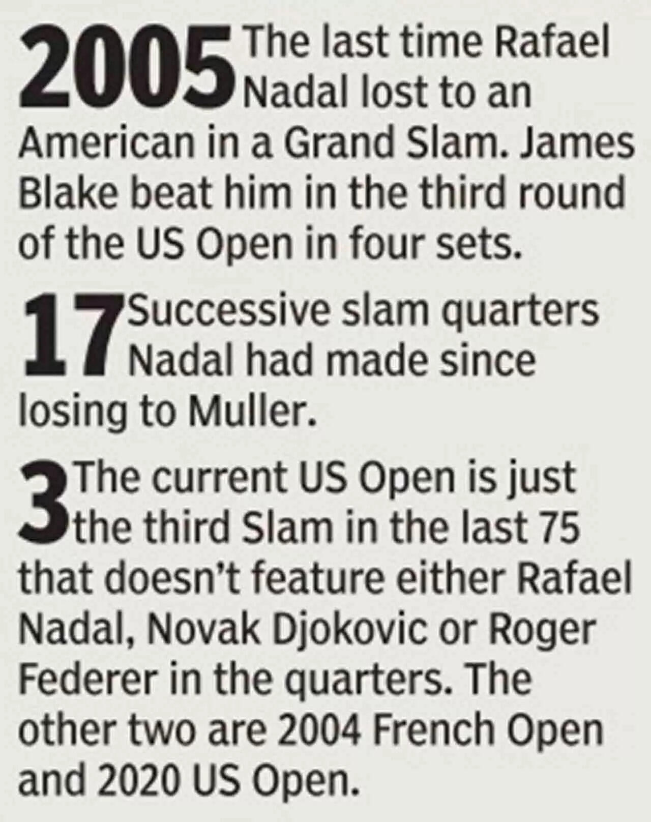 The story was in the stats perhaps. Nadal landed a mere 53 percent of first serves (60 of 114) and he converted just two of six break point opportunities. "I wasn't quick enough. He was able to take the ball early too many times, I was not able to push him back," the 22-time major winner said. "Tennis is a sport of position. You need to be very, very quick. In some way, the quality of my shots were poor," he said, "I was not able to create that much doubt for him."