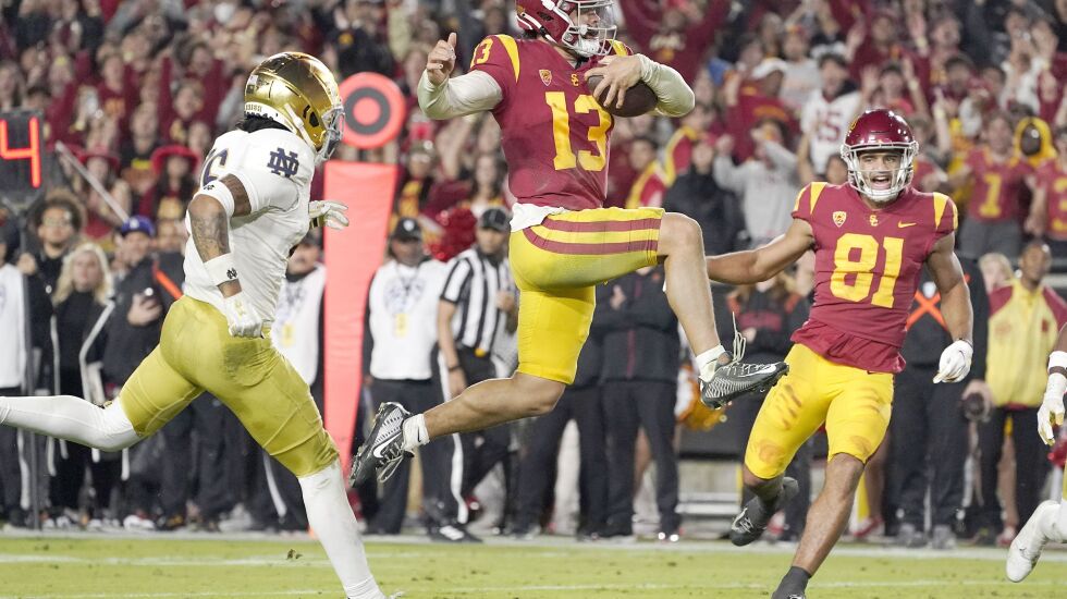 LOS ANGELES — Caleb Williams polished his Heisman Trophy credentials with 232 yards passing and four total touchdowns, and No. 5 Southern California capped its outstanding regular season under new coach Lincoln Riley by staying firmly in the College Football Playoff race with a 38-27 victory over No. 13 Notre Dame on Saturday night.