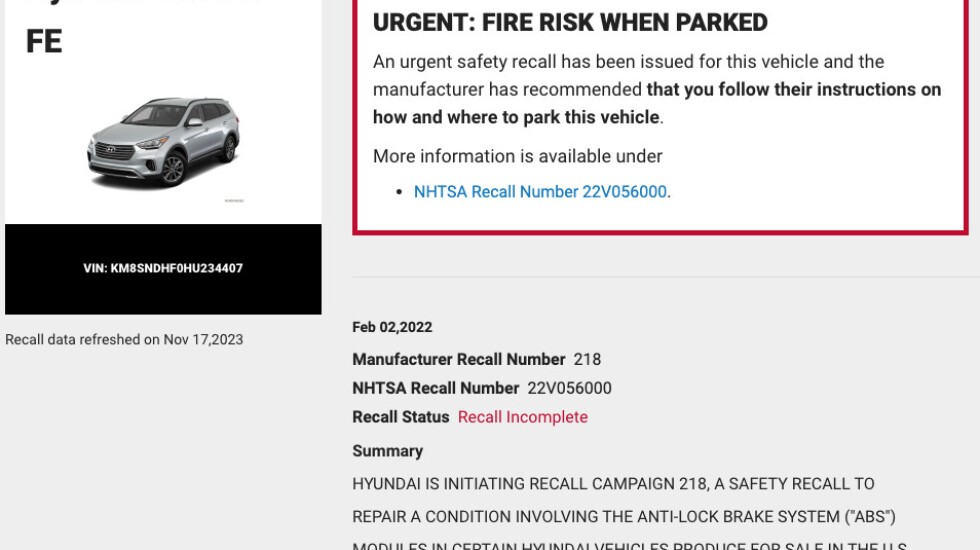 The Sun-Times even found recalled vehicles for sale to the public on the federal government’s General Services Administration website, including recalled Hyundai cars that face the same “Urgent: Fire risk when parked” notice.