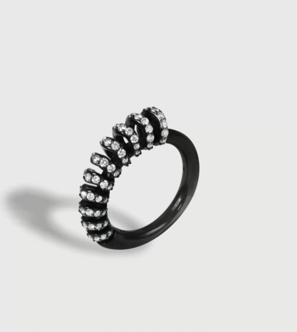 Looking for a unique and stylish piece? The Infinity Diamond Ring by LOUIZA Fine Jewellery features a dainty yet fluid design that is hand-crafted and made in Italy in 18K blackened white gold with ruthenium coating.