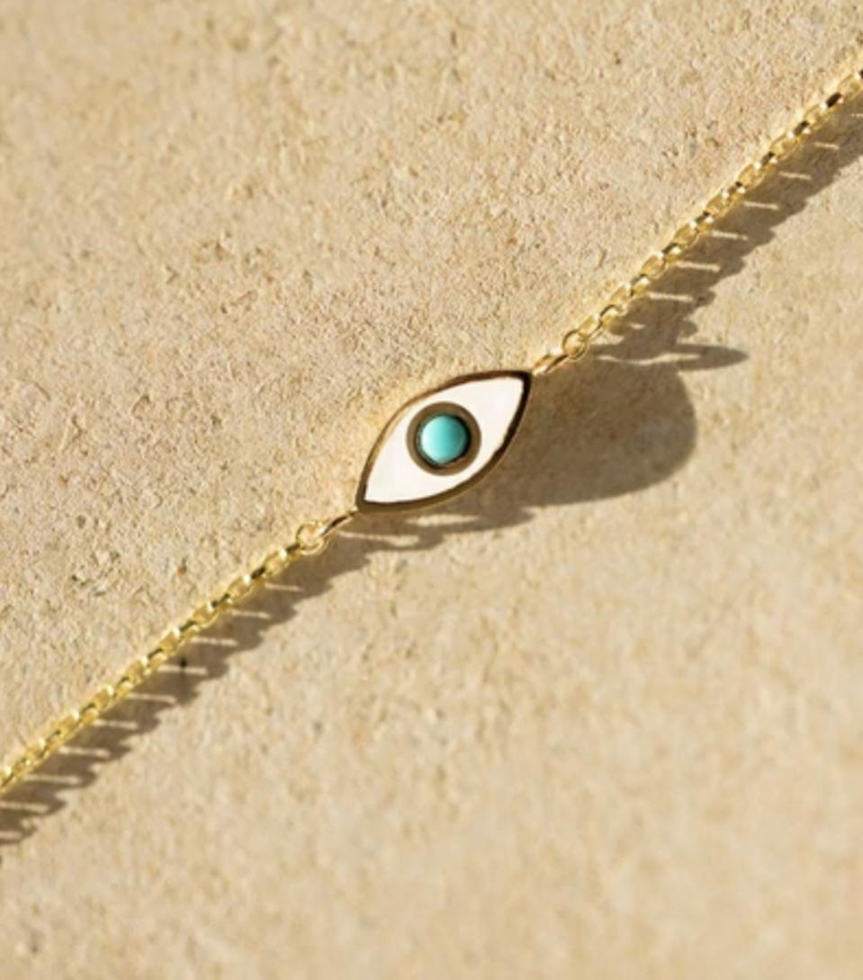 The British label AURUM + GREY is most loved for its delicate and barely-there designs, and the Enamel Turquoise Evil Eye Bracelet, made from solid 9ct Yellow Gold, white enamel and a 2mm turquoise cabochon centerpiece, is the definition of sophistication with a hint of fun.