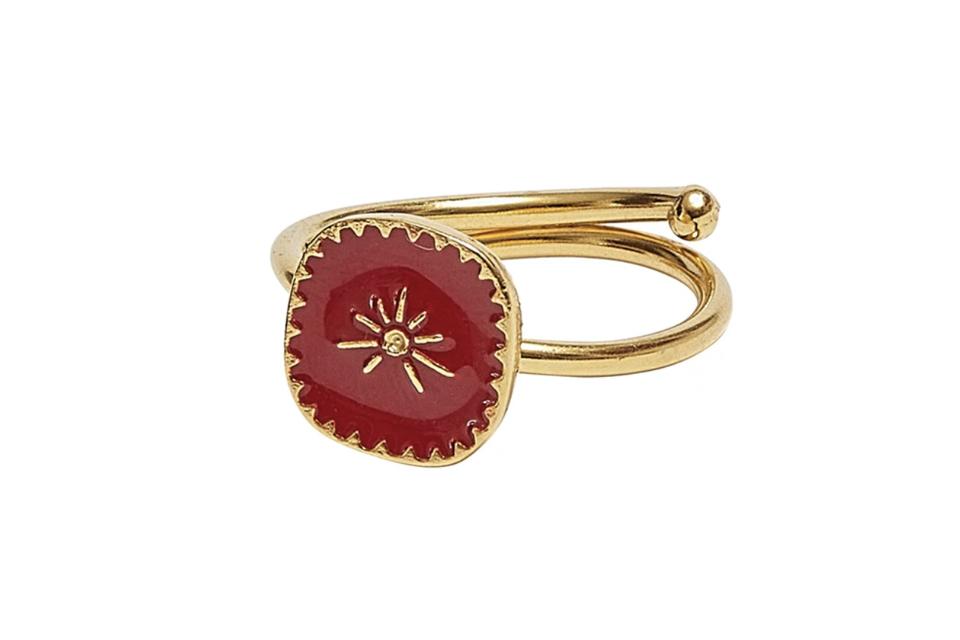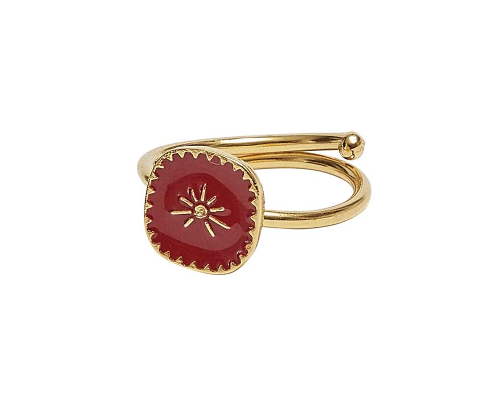 The Red Soru Star Ring by Soru Jewellery is a fun piece that can be worn alone or stacked. Featuring a red delicately hand enameled square with soft rounded corners, detailed gold boarder and a tiny beam star detail in the centre, the piece is handmade in Italy.