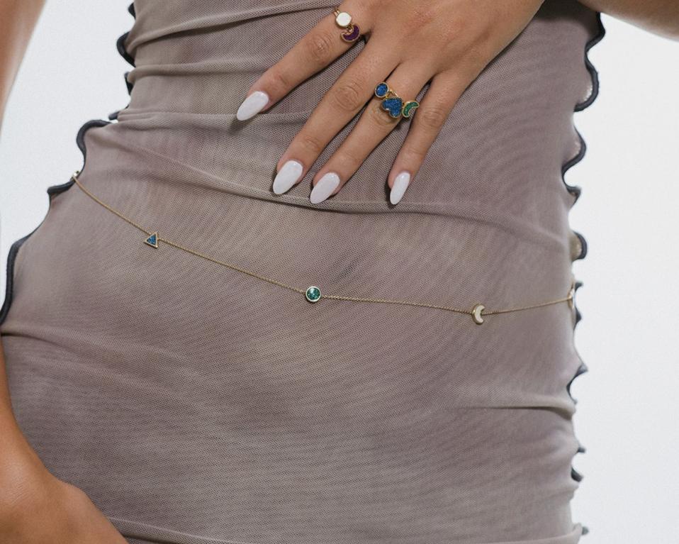 ALINA ABEGG’s playful Maxi Sticker Necklace is handcrafted in 14kt gold and features the brand’s signature triangle, circle, love and luna shapes made from smooth, glitter enamel. The necklace can also be worn at the hips as an out-of-this-world belt.