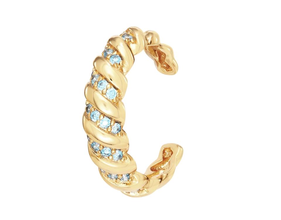 Celeste Starre is the go-to brand for jewelry pieces that are on-trend yet long-lasting. The aquamarine stones of The Katie Cuff in contrast with bright yellow gold creates a polished retro look that will look great day or night.