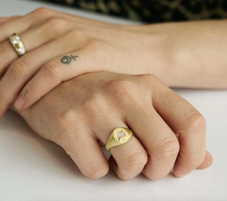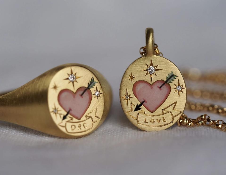You can’t go wrong with a piece of jewelry with heart shaped design on Valentine’s Day. The Love Me Forever Signet Ring by Cece Jewellery is made with frosted 18ct yellow gold with a tattoo inspired, hand-painted enamel heart pierced with Cupid’s arrow, completed with three star set diamonds. You can also choose a personal engraving or secret message for the banner beneath.