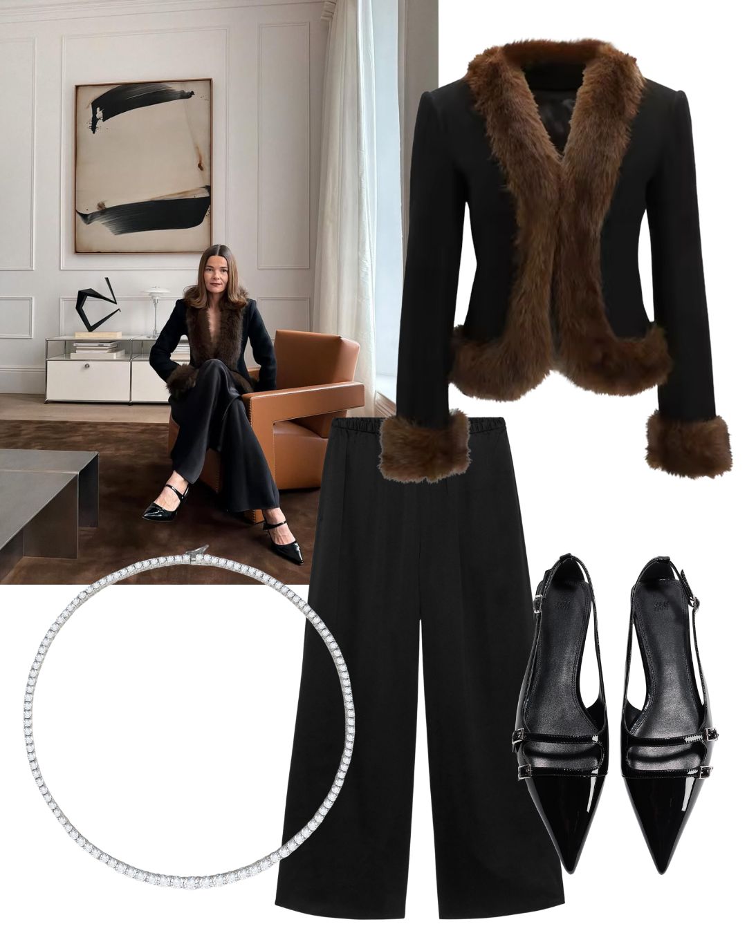 It's important to prioritise comfort when it comes to date-night dressing—that's when you can really relax and enjoy yourself, in my opinion—all while still looking chic, of course. To achieve this, I usually opt for head-to-toe black, sparkly jewellery and a smart flat over a heel. This Manière De Voir faux fur-trim jacket is my latest discovery, and perfect for the occasion (especially when worn with nothing underneath...).