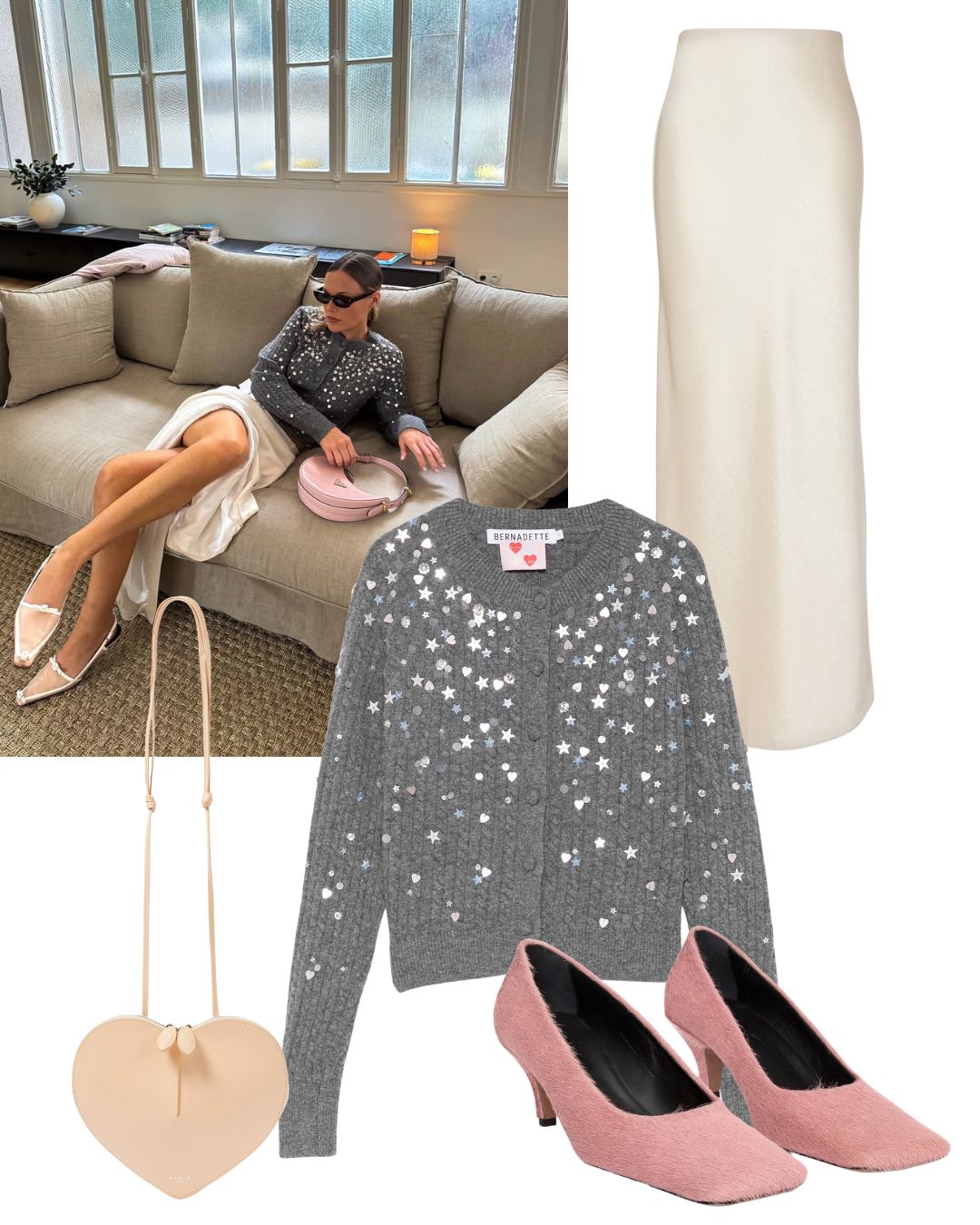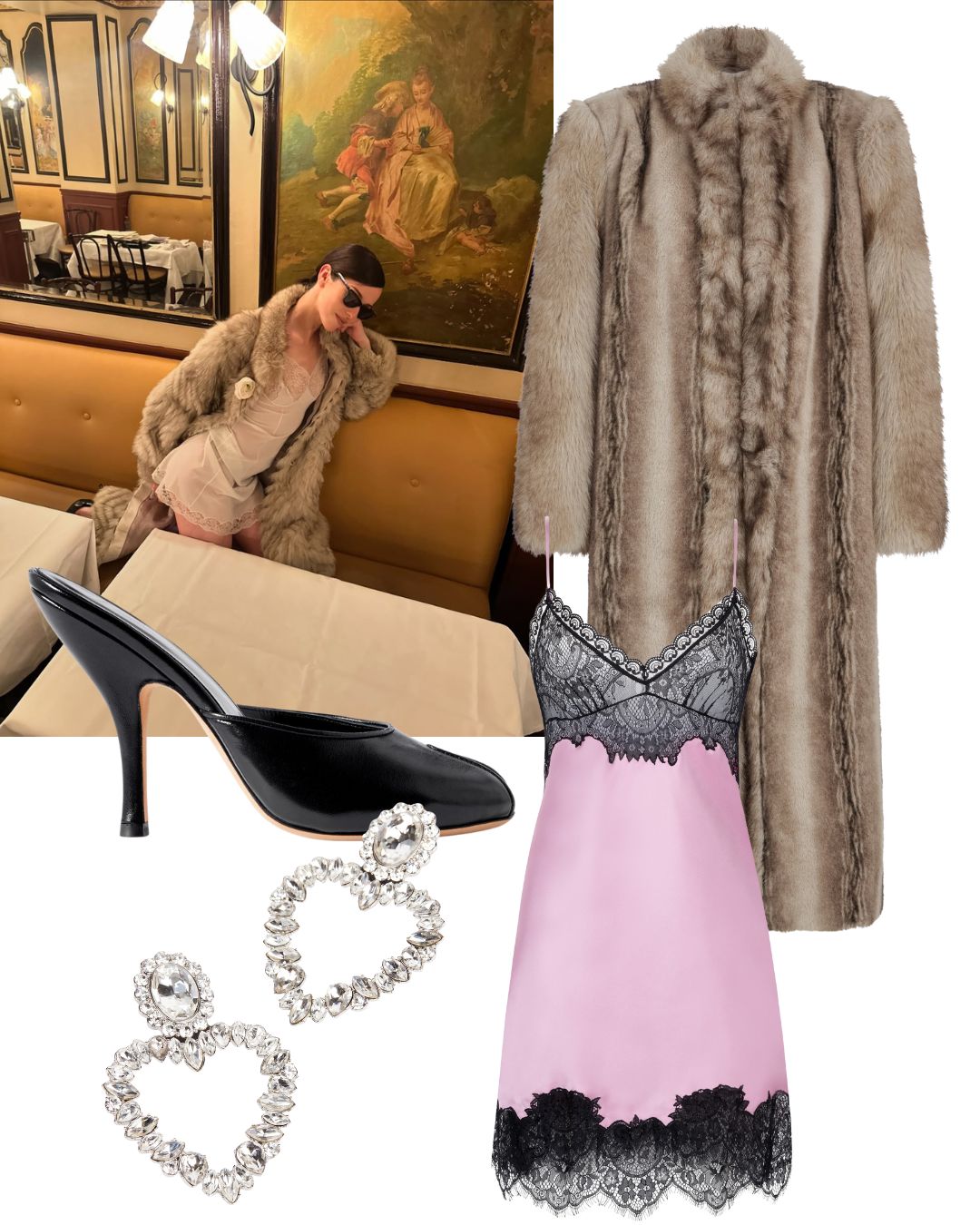 Lean into the romantic boudoir vibes with a silky lace-trim slip dress, a glamorous faux-fur coat, heels and sparkly earrings à la Amalie Gassmann. Being a little on the naughty, naked side is all part of the appeal, but you can also make the look more PG by adding sheer tights and a black cashmere cardi loosely buttoned over the top.