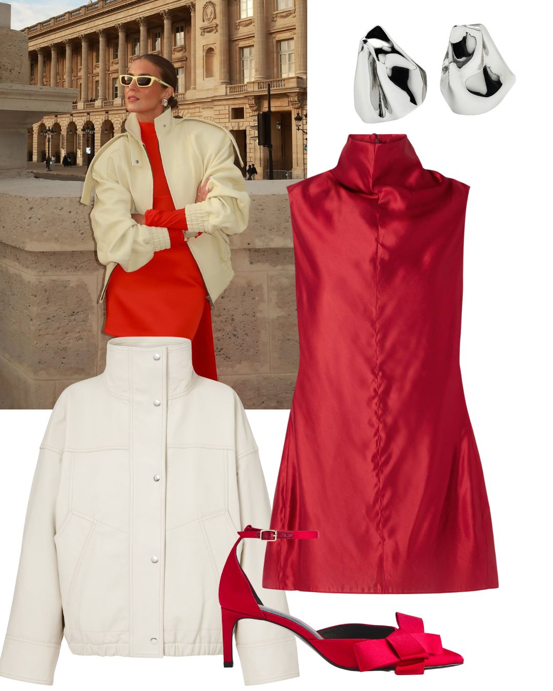 Forget the LBD: come Valentine's Day, it's all about the little red dress, as Nina Sandbech knows all too well. It's fun, flirty, sultry and impactful at the same time, especially if you add matching shoes—while an oversize funnel-neck leather jacket adds the perfect amount of insouciant, casual cool.