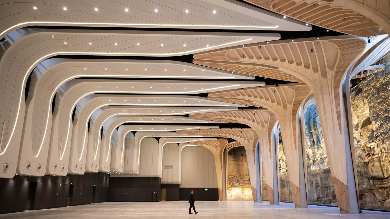 Indigenous references are woven all over the space, with eleven sculptural timber trees inspired by the Damun - or Port Jackson Fig - towering over the event hall and helping mitigate what developers described as a "traumatising" 15-second echo.