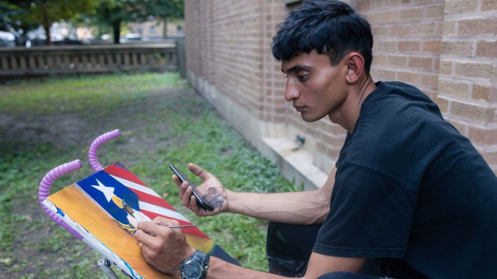 At 23, he’s already done a number of colorful murals for small businesses near the shelters he’s stayed in around Chicago, peppering North Side storefronts with many views of the Caribbean, Andes and plains of his homeland.