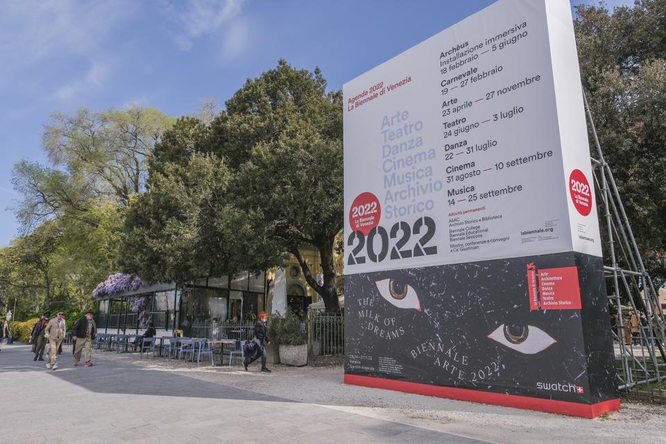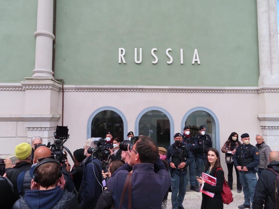 Artists Kirill Savchenkov and Alexandra Sukhareva and the curator Raimundas Malašauskas have pulled out of representing Russia at the 59th Venice Biennale as they disagree with the invasion of Ukraine. Their decision means that there is no official Russian representation this year. Regular performances protesting the Russian aggression are taking place outside their pavilion. And nearby, a temporary Ukraine installation symbolises strength and resilience: a wooden pavilion burned to strengthen the wood and a stack of sandbags used to protect statues.